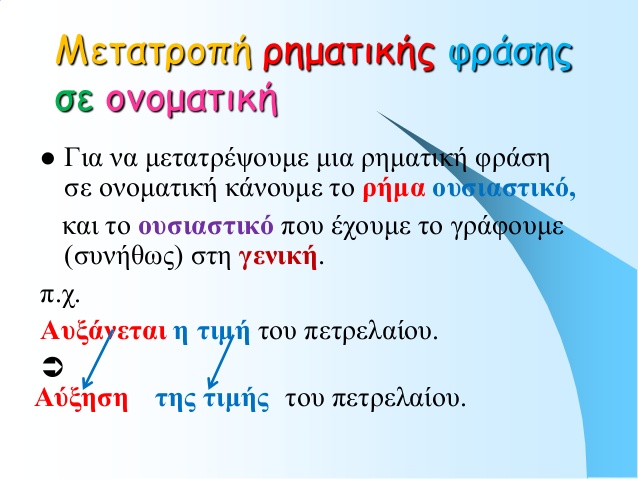 Ακόμη, θα δούμε πώς μπορούμε να μετατρέψουμε μια ονοματική φράση σε ρηματική και το αντίστροφο.