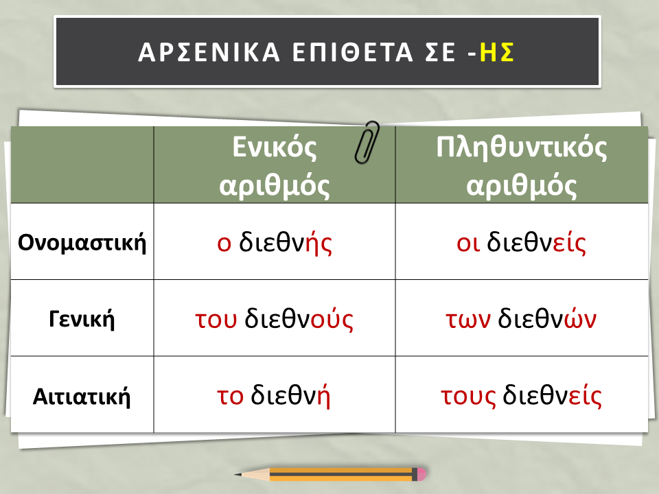 2. Διαβάστε ξανά την κλίση των επιθέτων σε -ης, -ης, -ες (βρίσκονται στη σελίδα 11 του Β΄ τεύχους του βιβλίου μας) και κλίνετε στο τετράδιο εργασιών σας τα επίθετα: ο ασθενής, ο δημοφιλής και ο επιμελής, στα τρία γένη, σε ενικό και πληθυντικό αριθμό.