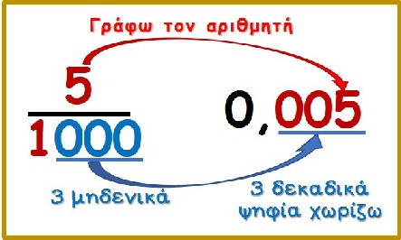 - και χωρίζουμε με υποδιαστολή, ξεκινώντας από δεξιά, τόσα δεκαδικά ψηφία, όσα μηδενικά είχε ο παρονομαστής.